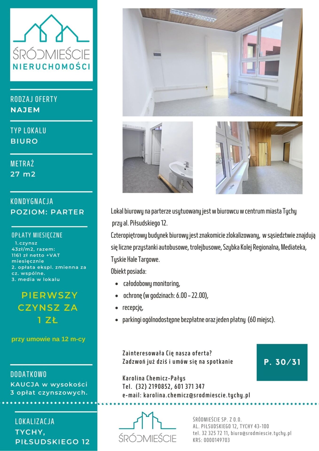 W ofercie posiadamy lokale od 20 m2 do 65 m2. Część lokali jest w pełni umeblowanych. Cena najmu lokalu jest zależna od piętra i powierzchni. Cena na wynajem już od 34,32 zł/m2 + zmienne opłaty eksploatacyjne + media. Czteropiętrowy budynek biurowy przy al. Piłsudskiego 12 znajduje się w ścisłym centrum miasta i otoczony jest znakomicie rozwiniętą siecią komunikacji miejskiej (liczne przystanki autobusowe, trolejbusowe oraz Szybka Kolej Regionalna). W sąsiedztwie biurowca znajduje się duży parking ogólnodostępny, oraz parking zamykany na 60 miejsc parkingowych (obecnie posiadamy 5 wolnych miejsc).